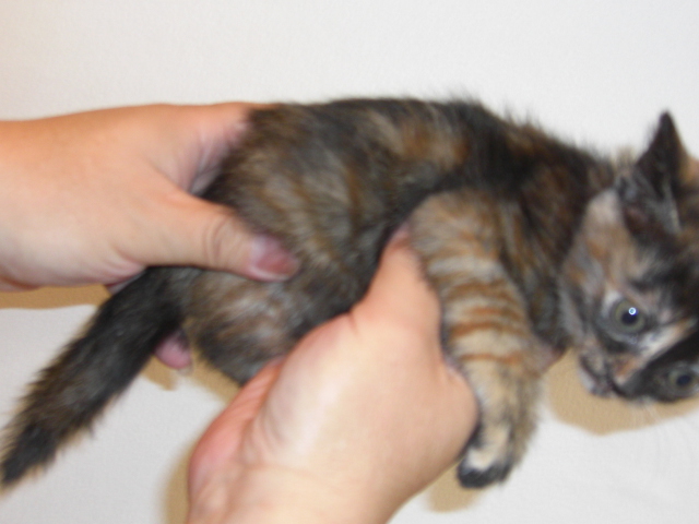 お母さんがシャム猫の雑種で、色は黒と茶色のまだらな子猫です。生後約二ヶ月の元気な女の子です。