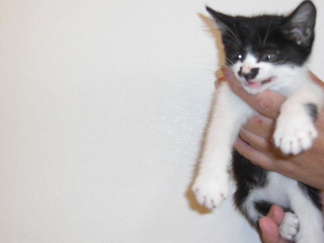 一匹目は、白黒の子猫です。やんちゃで甘えん坊な生後二ヶ月の男の子です。